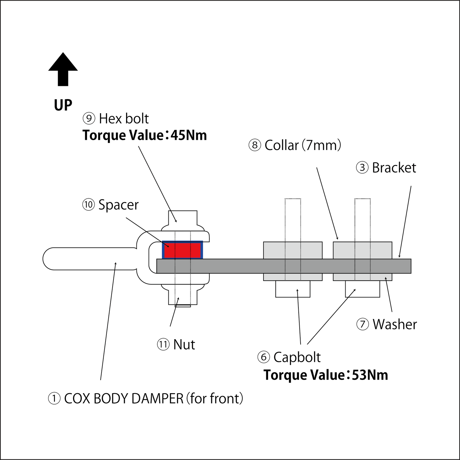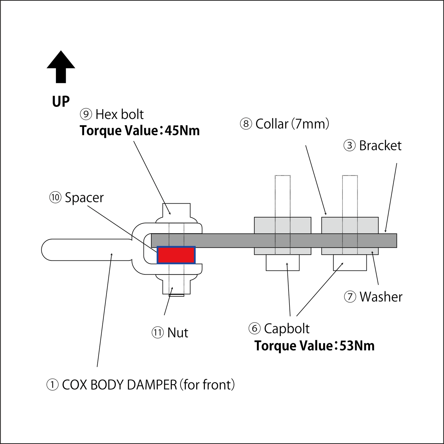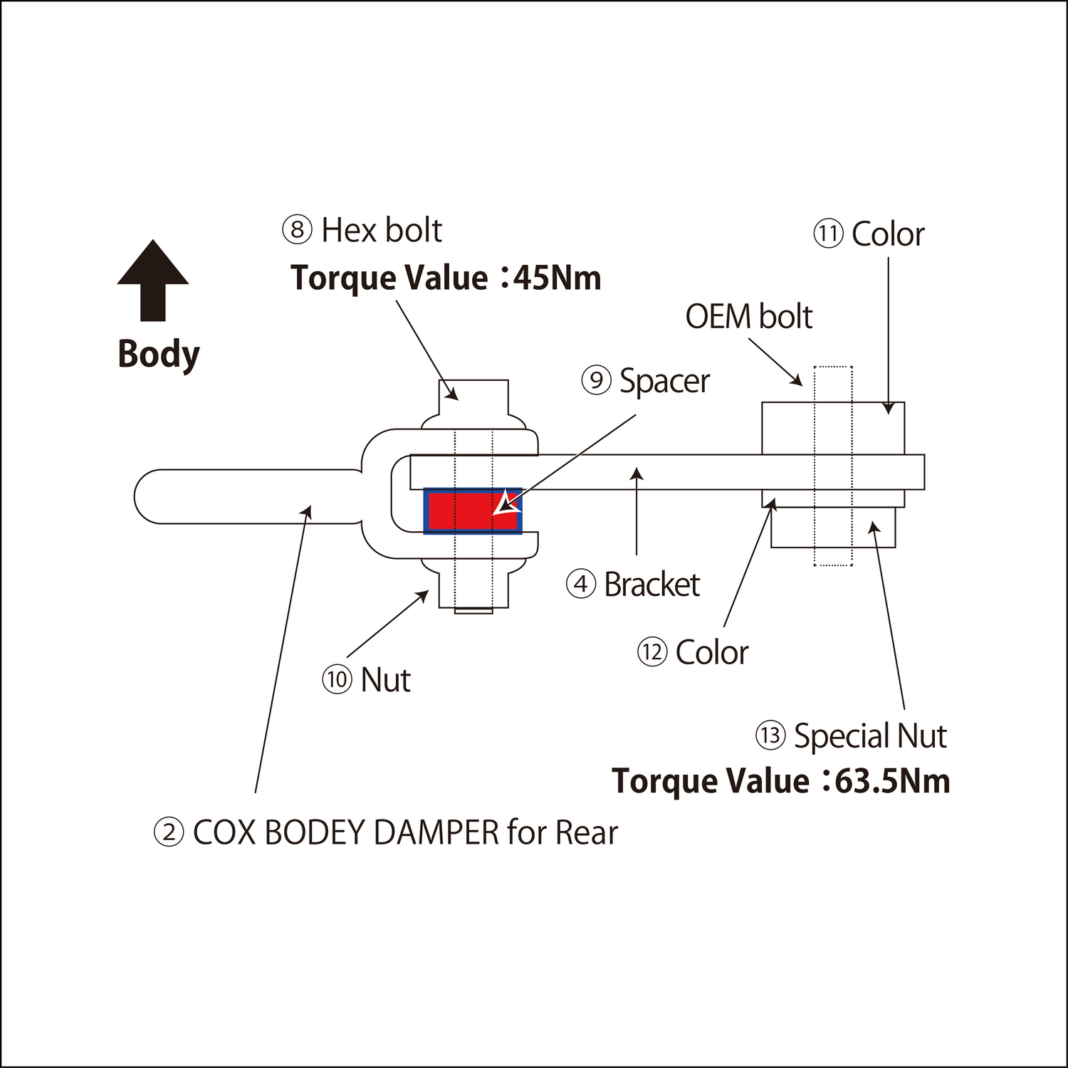 Referring to the image, assemble "2.Body (for rear)" with "9.M10×30 Hex bolt”, "10.Spacer" "11.Nut" and tighten both sides.