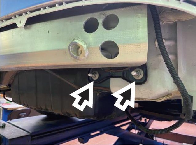 Refer to the image and remove the two mounting nuts from the rear bumper beam.